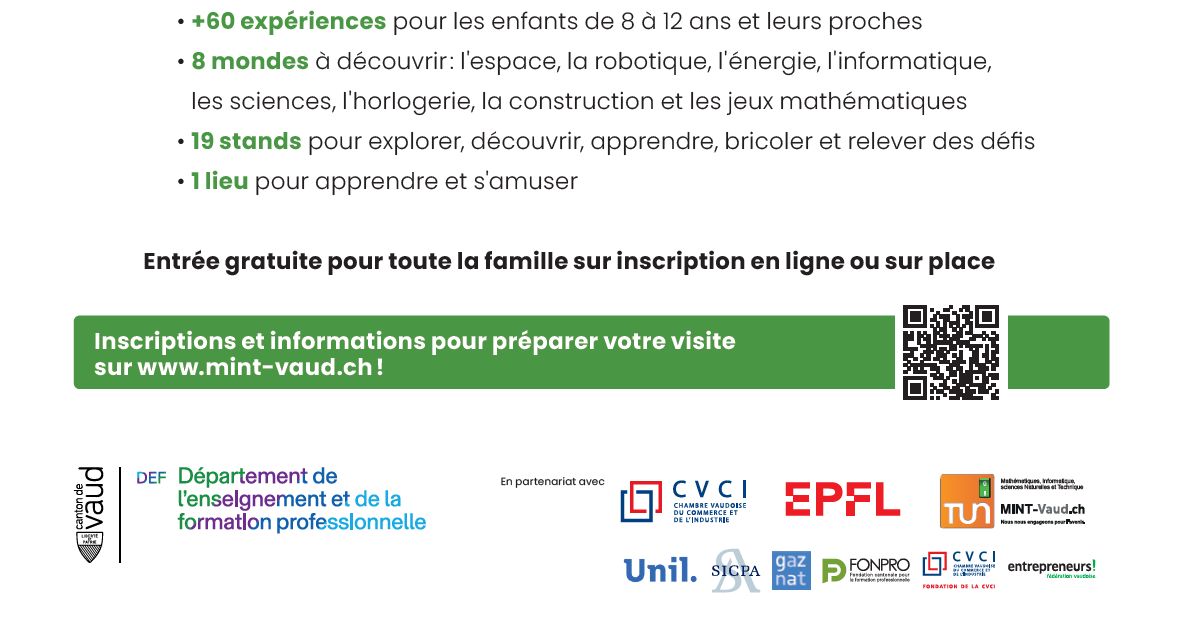 Vous trouverez ci-dessous le QR-Code du salont MINT Vaud. De plus amples informations sont disponibles sur mint-vaud.ch/parents.
